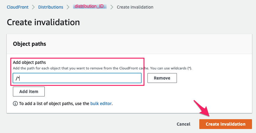 aws cloudfront create-invalidation --distribution-id distribution_ID --paths "/*"