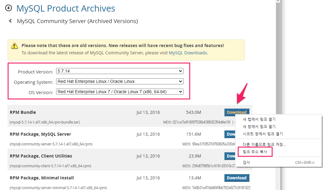 mysql 5.7.14 패키지 다운로드