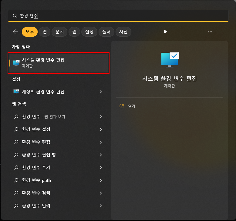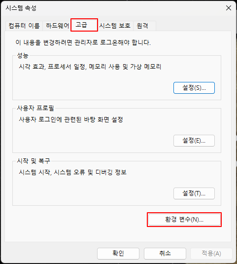 - "시스템 환경 변수 편집" 창을 엽니다.