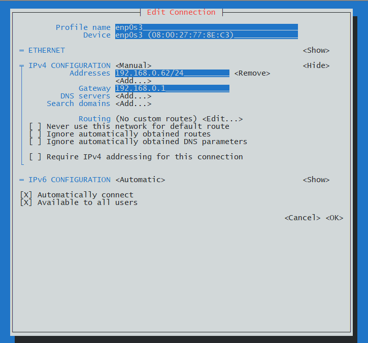 nmtui edit enp0s3