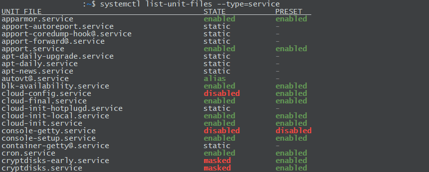 시스템에 설치된 모든 서비스 유닛 파일을 나열하며 각 서비스의 상태(예: enabled, disabled, static 등)도 함께 보여줍니다.