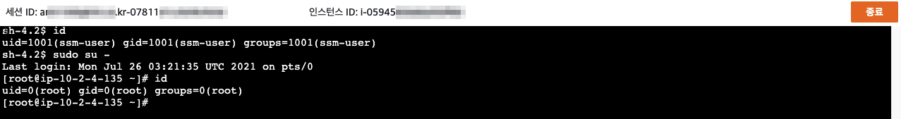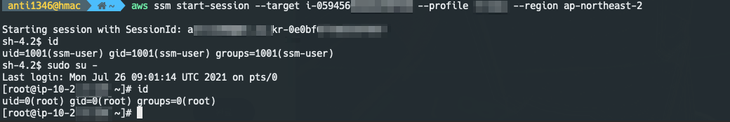 aws ssm start-session --target i-05945 --profile testprofile --region ap-northeast-2