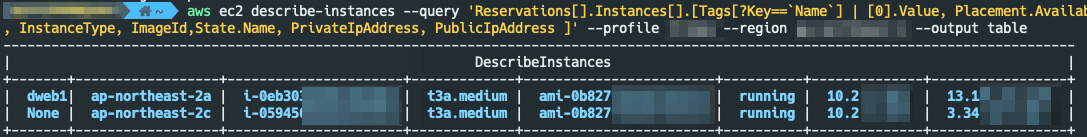 --query 'Reservations[].Instances[].[Tags[?Key==`Name`] | [0].Value, Placement.AvailabilityZone,InstanceId, InstanceType, ImageId,State.Name, PrivateIpAddress, PublicIpAddress ]' \
