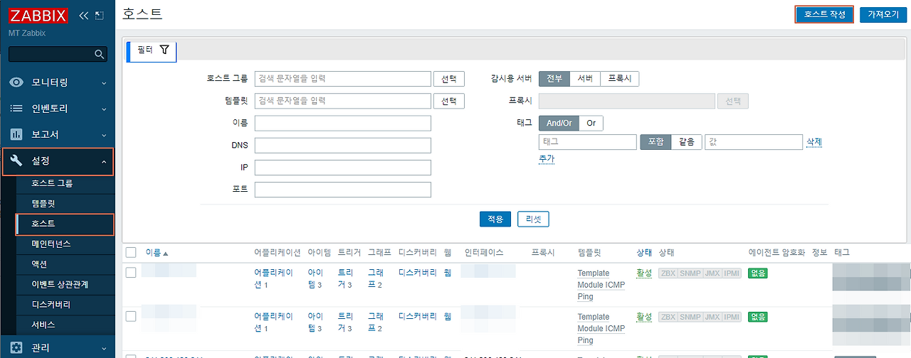 설정 > 호스트 > 호스트 작성