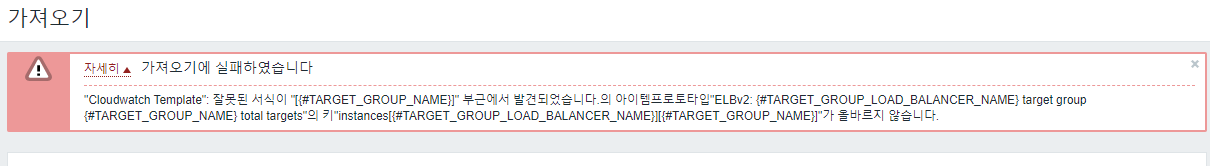 cloudwatch_template.xml 편집 전에 파일을 임포트(가져오기) 시키면 zabbix-server 5.0 버전에서는 아래와 같은 에러가 발생합니다.