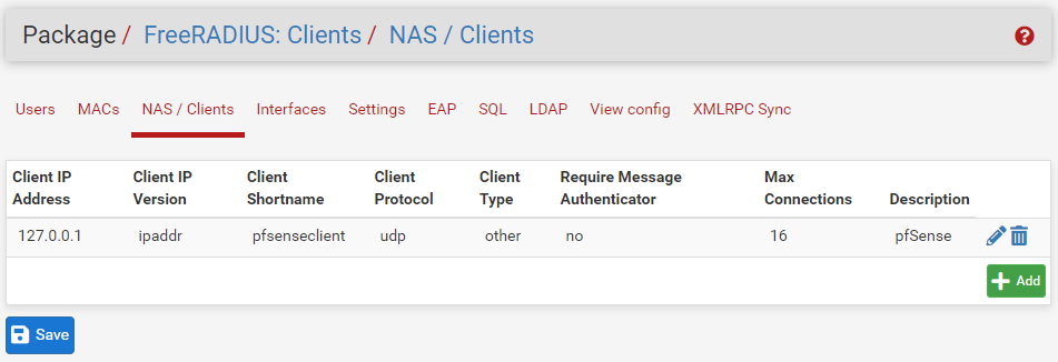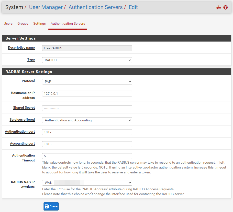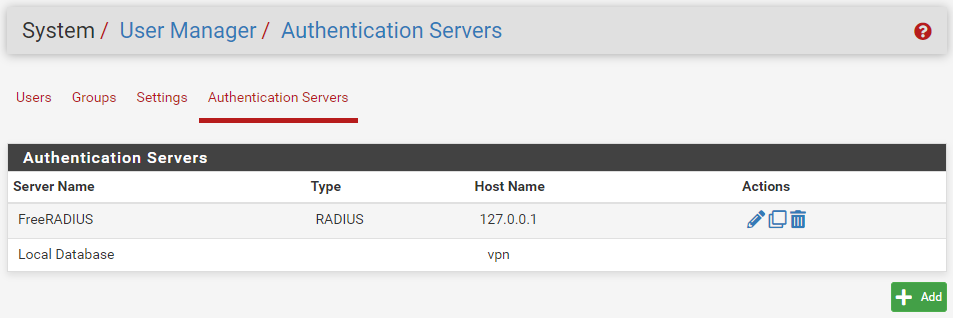 pfSense가 FreeRADIUS를 사용하여 인증할 수 있도록 인증 서버를 추가합니다.