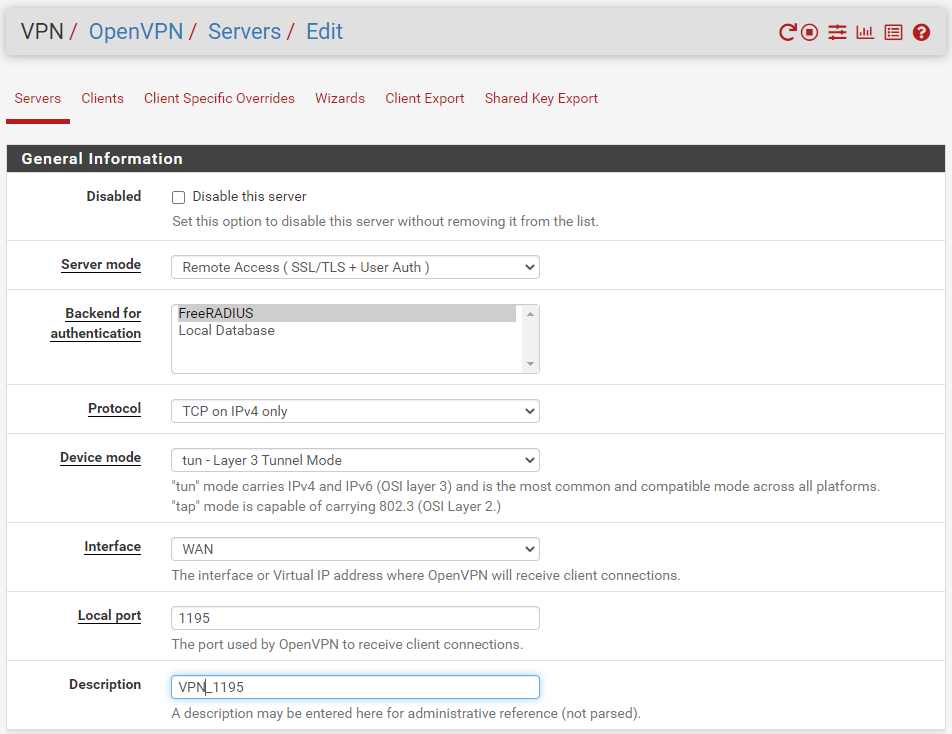 OpenVPN 서버 구성에서 인증을 위한 백엔드로 FreeRADIUS를 선택합니다.