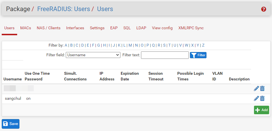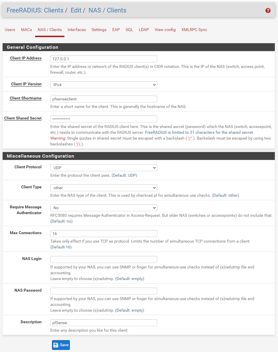 pfSense가 FreeRADIUS를 사용하여 인증할 수 있도록 인증 서버를 추가합니다.