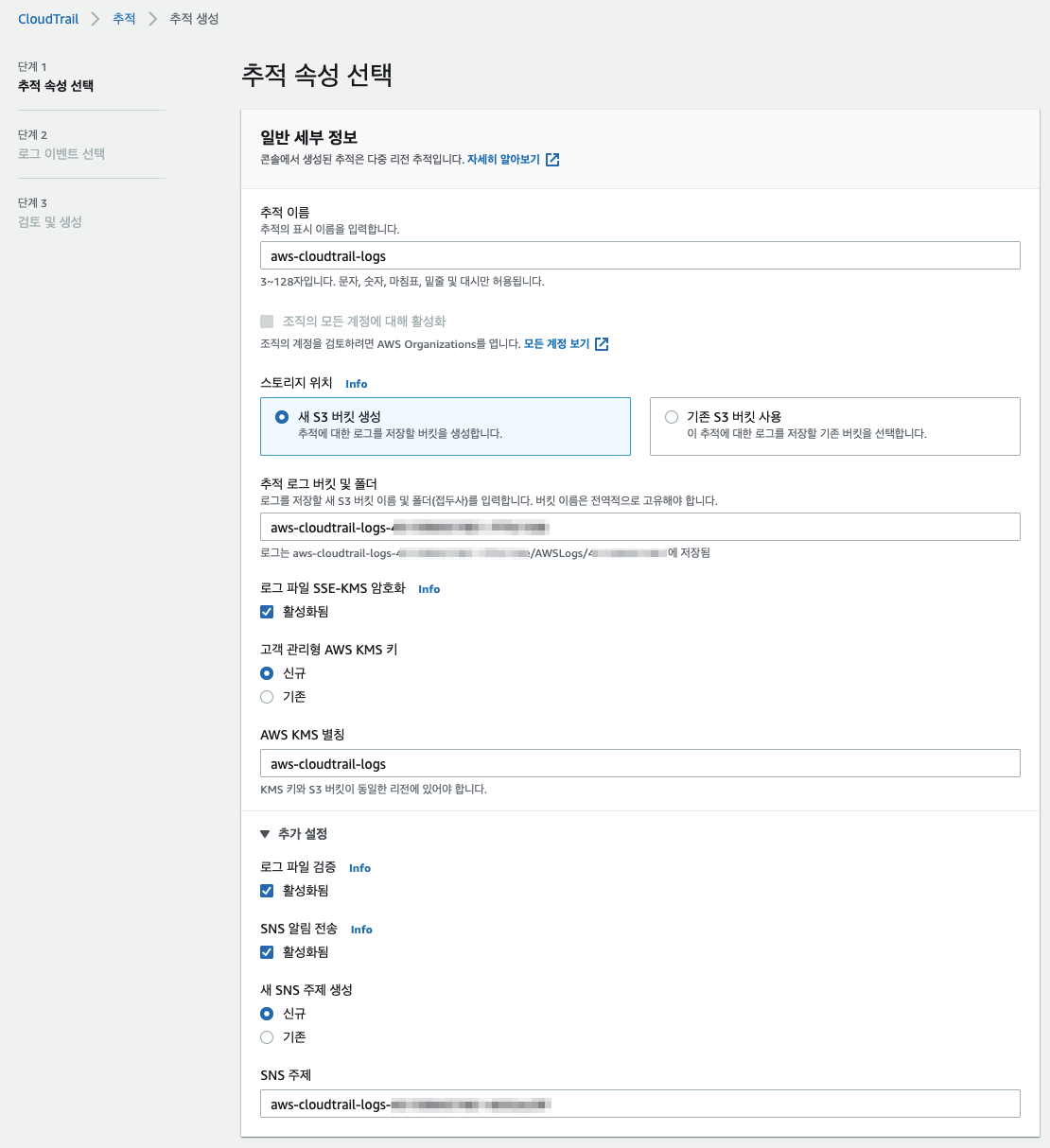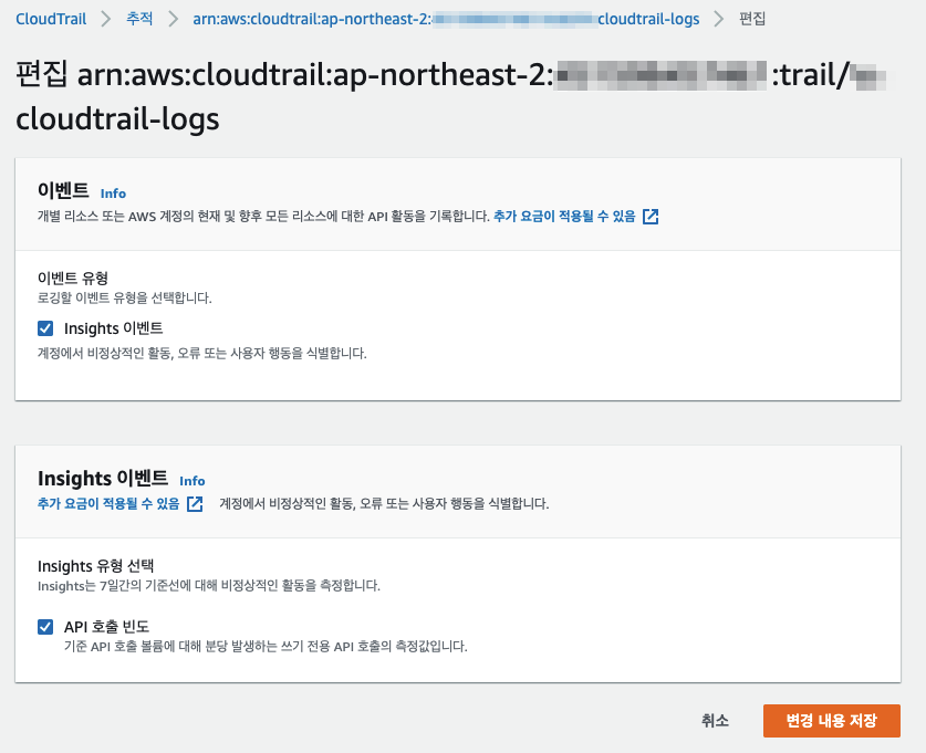 CloudTrail > 추적 > arn:aws:cloudtrail:ap-northeast-2:{AWS ACCOUTE ID}:trail/aws-cloudtrail-logs
