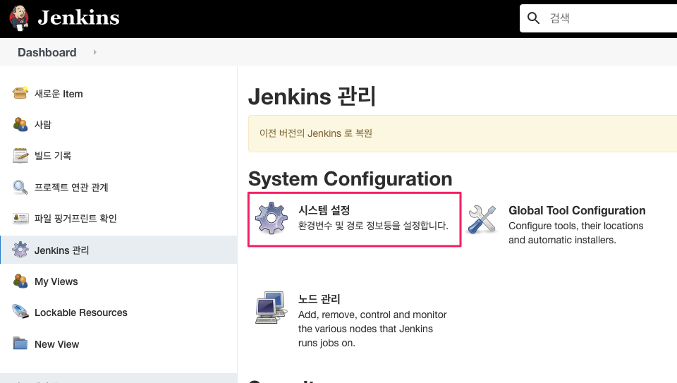 Dashboard > Jenkins 관리 > System Configuration > 시스템 설정