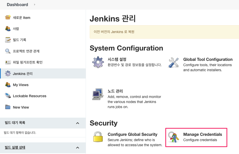 Dashboard > Jenkins 관리 > Security > Manage Credentials