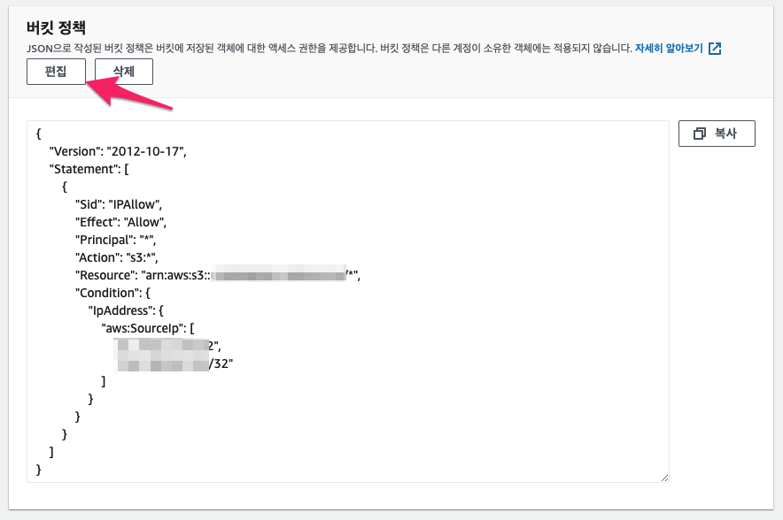 여기서 your-bucket-name은 해당 S3 버킷의 이름이며, 111.111.111.111은 허용하려는 IP 주소입니다.