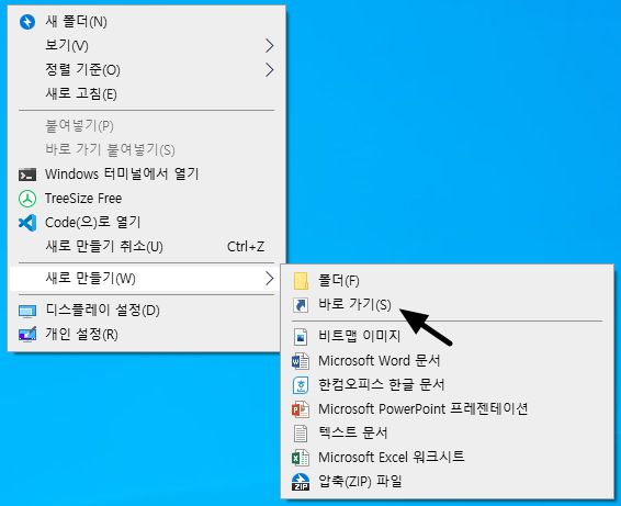 새로 만들기(W) > 바로 가기(S)