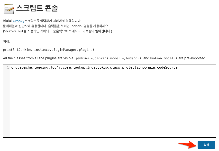 Jenkins 보안팀은 Log4j가 Jenkins 코어에서 사용되지 않음을 확인했습니다. Jenkins 플러그인이 Log4j를 사용 중일 수 있습니다. 스크립트 콘솔에서 다음 Groovy 스크립트를 실행하여 Log4j가 플러그인에 포함되어 있는지 확인할 수 있습니다.