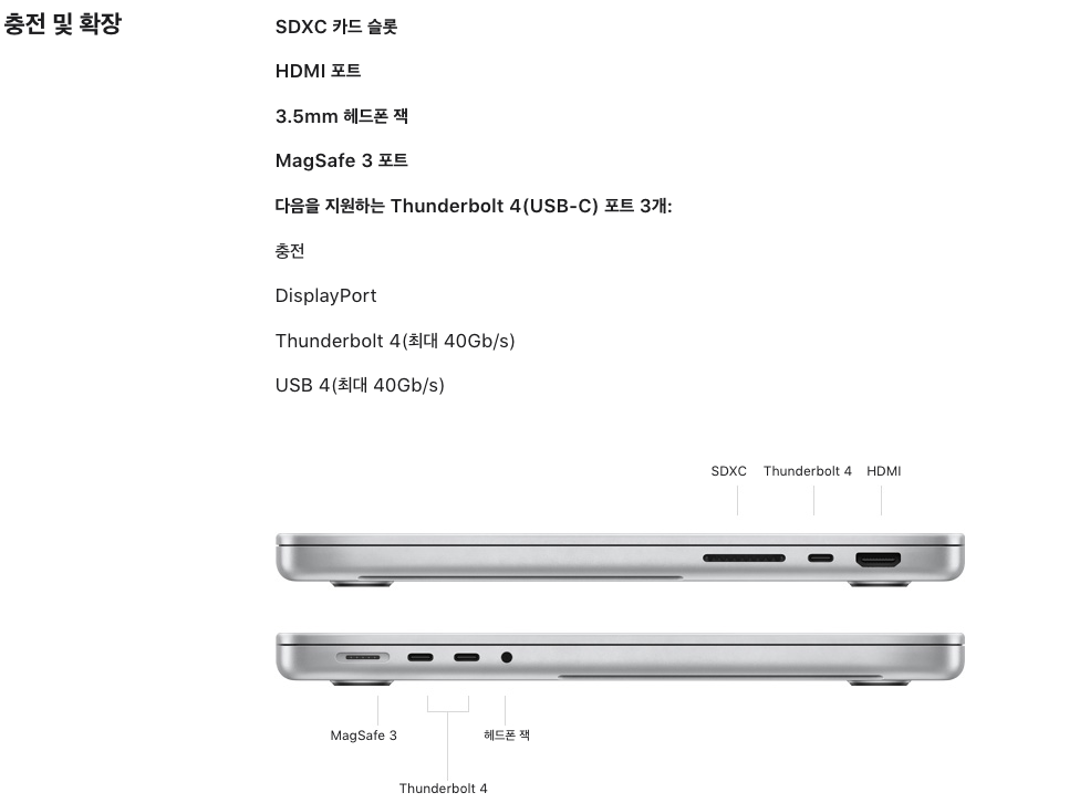 - Thunderbolt 4 포트 3개, HDMI 포트, SDXC 카드 슬롯, MagSafe 3 포트