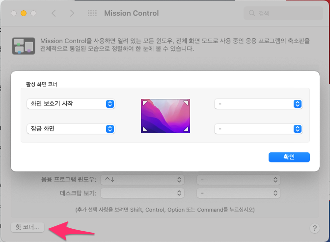 애플 메뉴 > 시스템 환경설정 > Mission Control > 핫 코너
