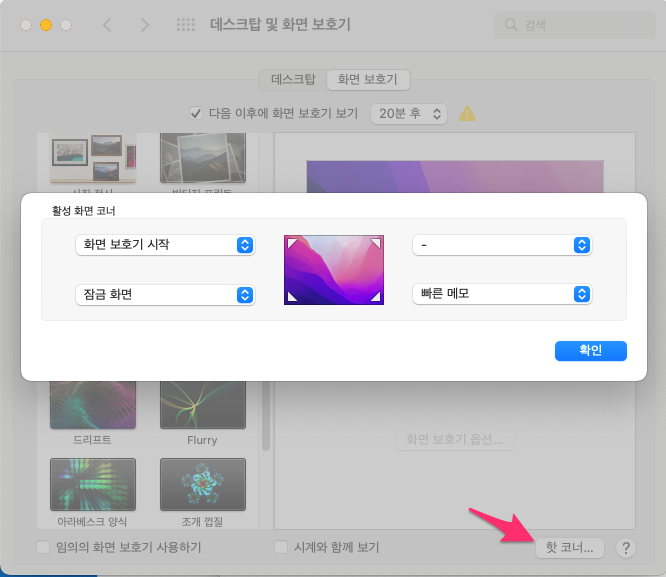 애플 메뉴 > 시스템 환경설정 > 데스크탑 및 화면 보호기 > 핫 코너