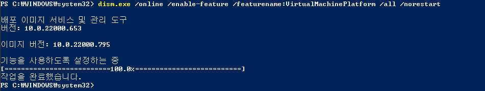 dism.exe /online /enable-feature /featurename:VirtualMachinePlatform /all /norestart