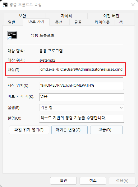 - 대상(T) : %windir%\system32\cmd.exe /k C:\Users\Administrator\aliases.cmd
