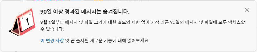 2022년 9월 1일부터 무료 플랜 제한이 간소화됩니다. 1만 건의 메시지 한도와 5GB의 스토리지 대신 지난 90일간의 메시지 내역과 파일 스토리지에 대한 완전한 액세스를 제공하여 팀이 언제 한도에 도달할지 걱정할 필요가 없습니다. 또한 클립과 메시지 및 파일 보존 설정을 비롯한 여러 기능에 대한 액세스가 확대됩니다. 아래에서 예정된 변경 사항에 대한 FAQ를 확인하세요.