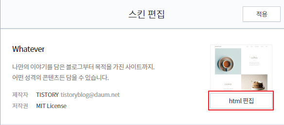 티스토리 관리자 페이지 > 꾸미기 > 스킨 편집 > html 편집