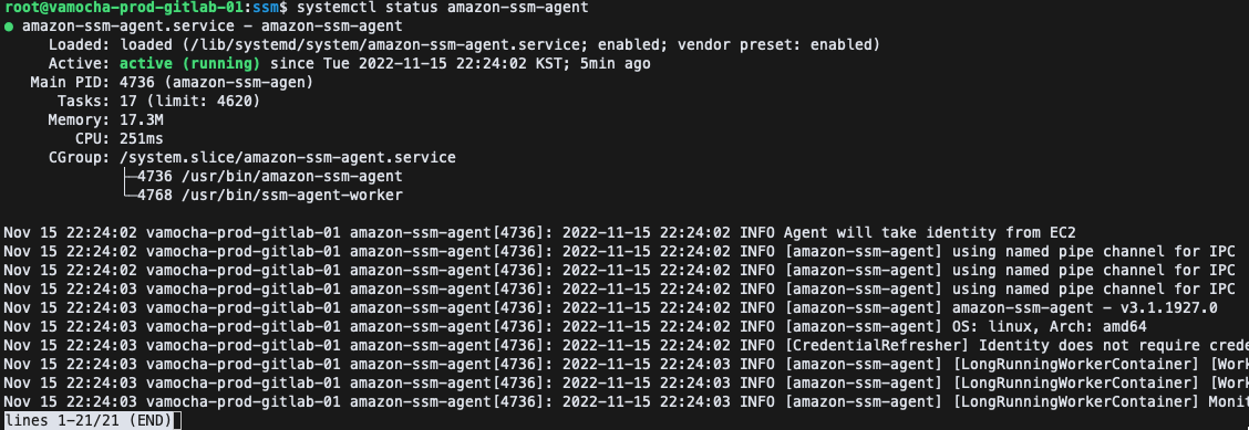 SSM Agent가 정상적으로 실행 중인지 확인합니다.