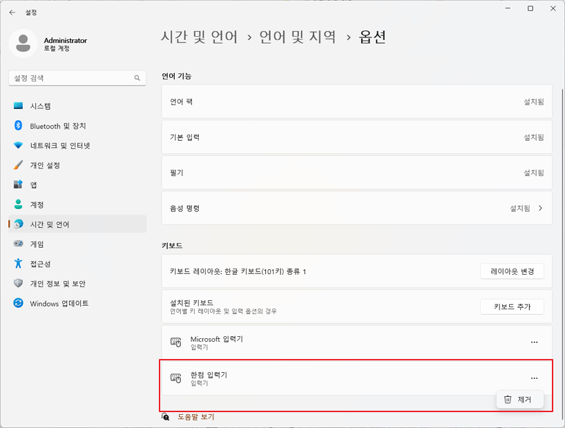 언어 옵션: 한국어 > 한컴 입력기 > 삭제