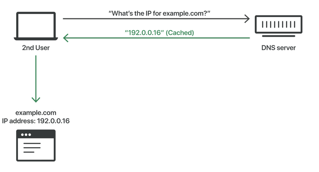 DNS 서버는 이전에 수행한 DNS 조회 결과를 메모리나 디스크와 같은 로컬 저장소에 저장합니다. 이는 동일한 조회가 반복될 때 재조회를 하지 않고 저장된 결과를 반환함으로써 네트워크 대역폭을 절약하고 조회 응답 시간을 단축시킵니다. 일반적으로 DNS 캐시의 만료 시간(TTL)을 설정하여 캐시된 항목이 유효한 기간 동안 저장되도록 관리합니다.