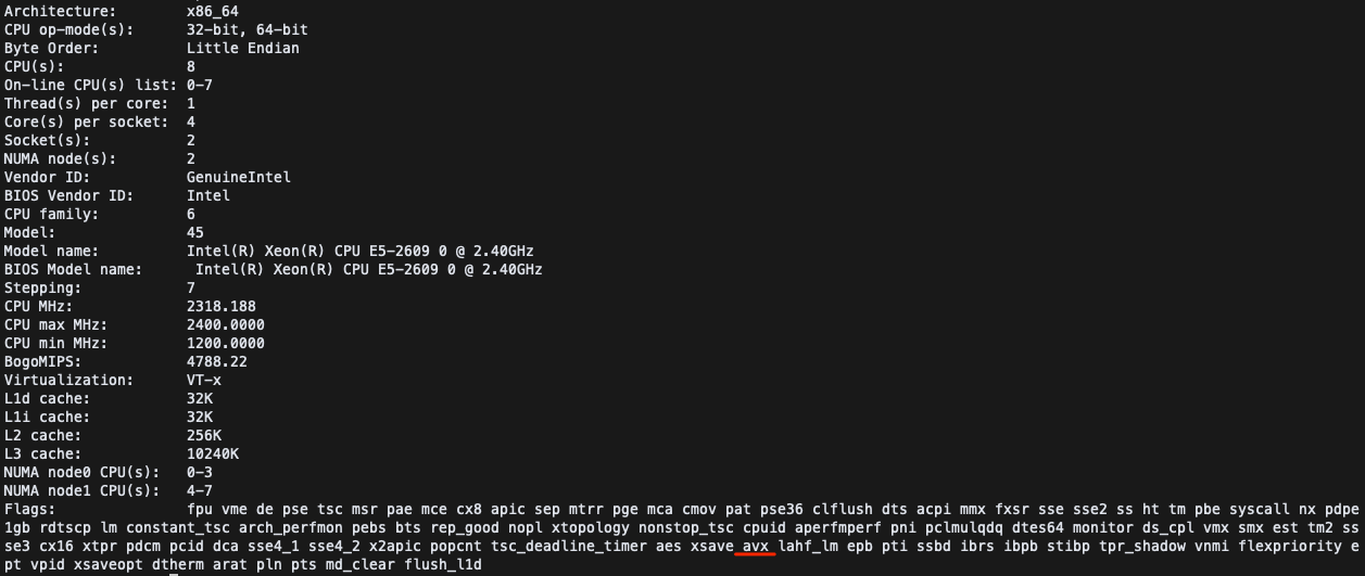 "cat /proc/cpuinfo" 명령어 flags 항목에서 찾을 수 있음