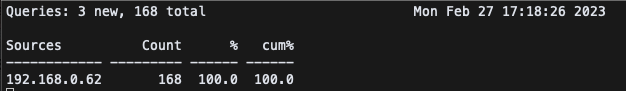 sudo dnstop -l 5 -T total -r /var/log/named/query.log