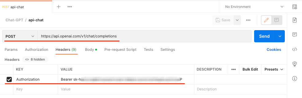 3. Headers 탭으로 이동하여 Authorization 헤더를 추가합니다. 이 헤더의 값으로는 "Bearer"와 API 키를 조합한 문자열을 사용합니다. 예를 들어, "Bearer abcdefg1234567890"과 같이 입력합니다.