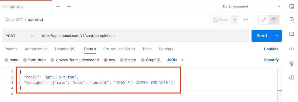 4. Body 탭으로 이동하여 JSON 형식으로 데이터를 입력합니다. 데이터는 GPT-3 모델에 대한 입력 텍스트와 해당 모델에서 얻을 출력의 형식을 지정하는 JSON 객체로 구성됩니다. 예를 들어, 다음과 같은 JSON 데이터를 사용할 수 있습니다.