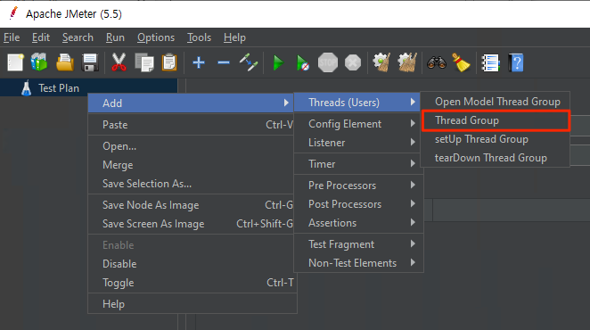 Test Plan 안에 Thread Group을 추가하고 원하는 스레드 수, 루프 수 등을 설정합니다. - Sampler 추가