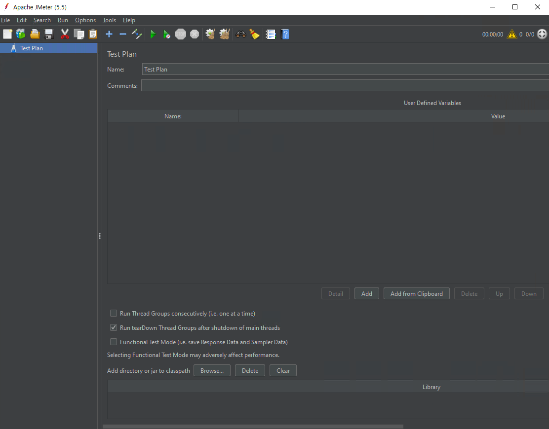 JMeter에서는 테스트를 "Test Plan"이라는 구조 안에서 관리합니다. 새로운 Test Plan을 만들고 원하는 요소들을 추가합니다. - Thread Group 설정