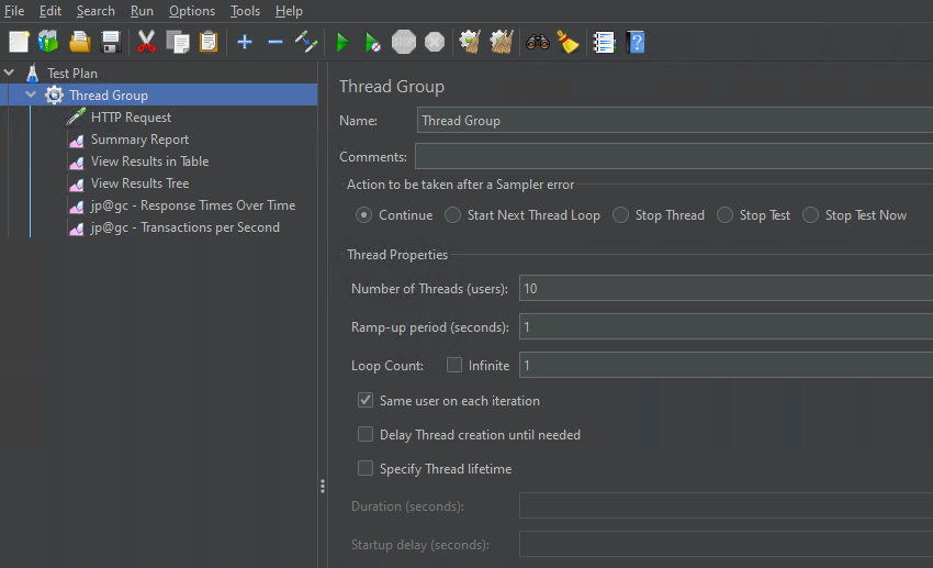 - Loop Count : 각 스레드가 테스트 계획을 실행하는 횟수를 나타냅니다. 0으로 설정하면 무한 반복됩니다.