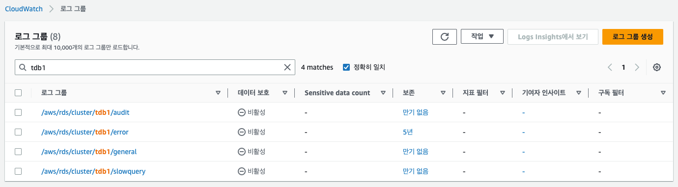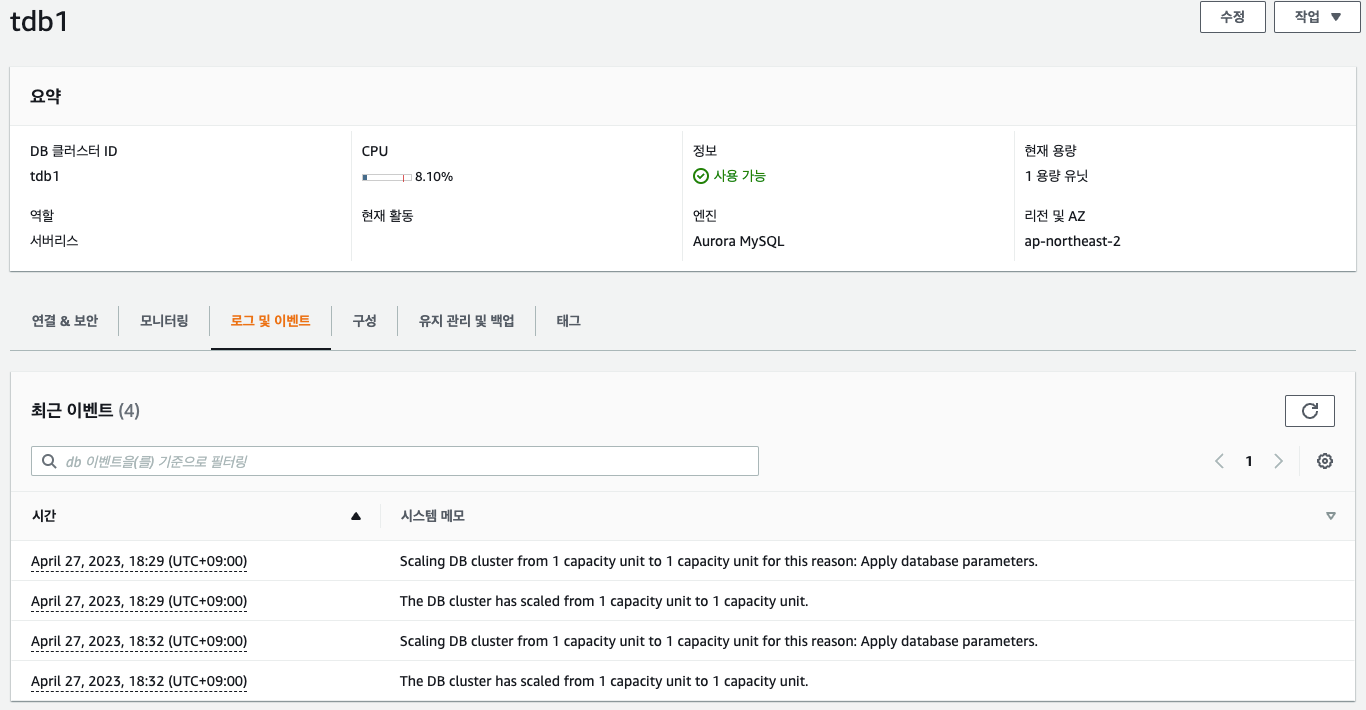 Amazon RDS > 대시보드 > DB 클러스터 > DB 식별자(tdb1) > 로그 및 이벤트