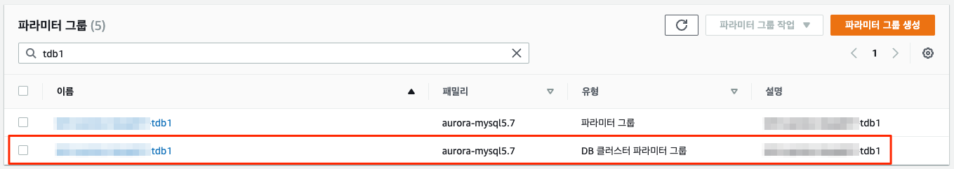 - DB 클러스터 파라미터 그룹 이름 : (tdb1)