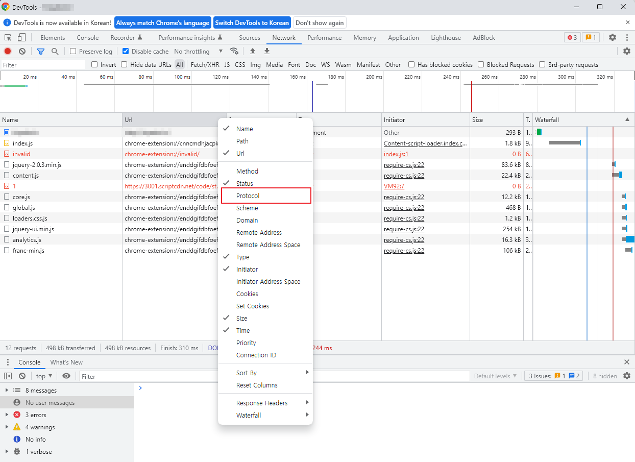 - 여러(Name, Url, Status) 탭 중 한 곳에서 오른쪽 버튼을 클릭하여 Protocol 항목을 활성화함