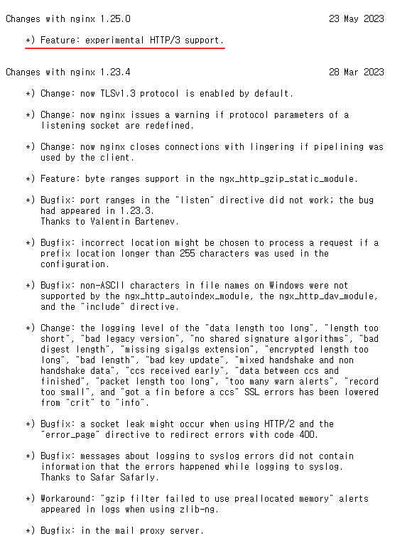 - HTTP/3 지원을 위해 mainline 버전 사용을 권장합니다.
