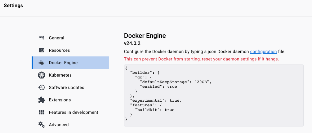 Docker Desktop을 실행한 후, Docker Desktop 메뉴를 열고 "Settings"를 선택합니다. "Settings"에서 "Docker Engine" 탭을 선택하고 experimental 옵션을 추가합니다.