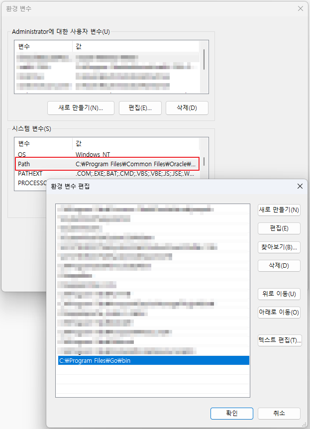 Go의 설치 경로를 추가합니다. 예를 들어, "C:\Go\bin"을 입력합니다.