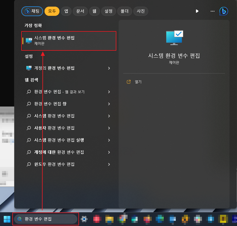 시스템 환경 변수 편집을 엽니다. 이를 위해 "시작 메뉴"에서 "환경 변수 편집"을 검색하고 선택합니다.