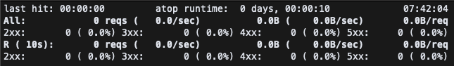 위 명령은 /var/log/httpd/access_log 경로에 있는 Apache 액세스 로그 파일을 사용하여 apachetop을 실행합니다. apachetop 창에서 실시간으로 트래픽 정보를 확인할 수 있습니다.