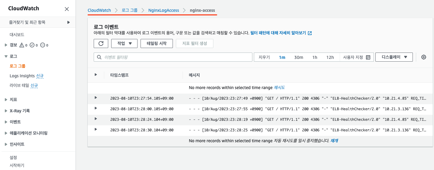 이러한 과정을 통해 Nginx와 PHP-FPM의 로그 데이터를 CloudWatch에 수집하여 저장할 수 있습니다. 이것은 애플리케이션 모니터링과 문제 해결에 유용한 도구입니다.