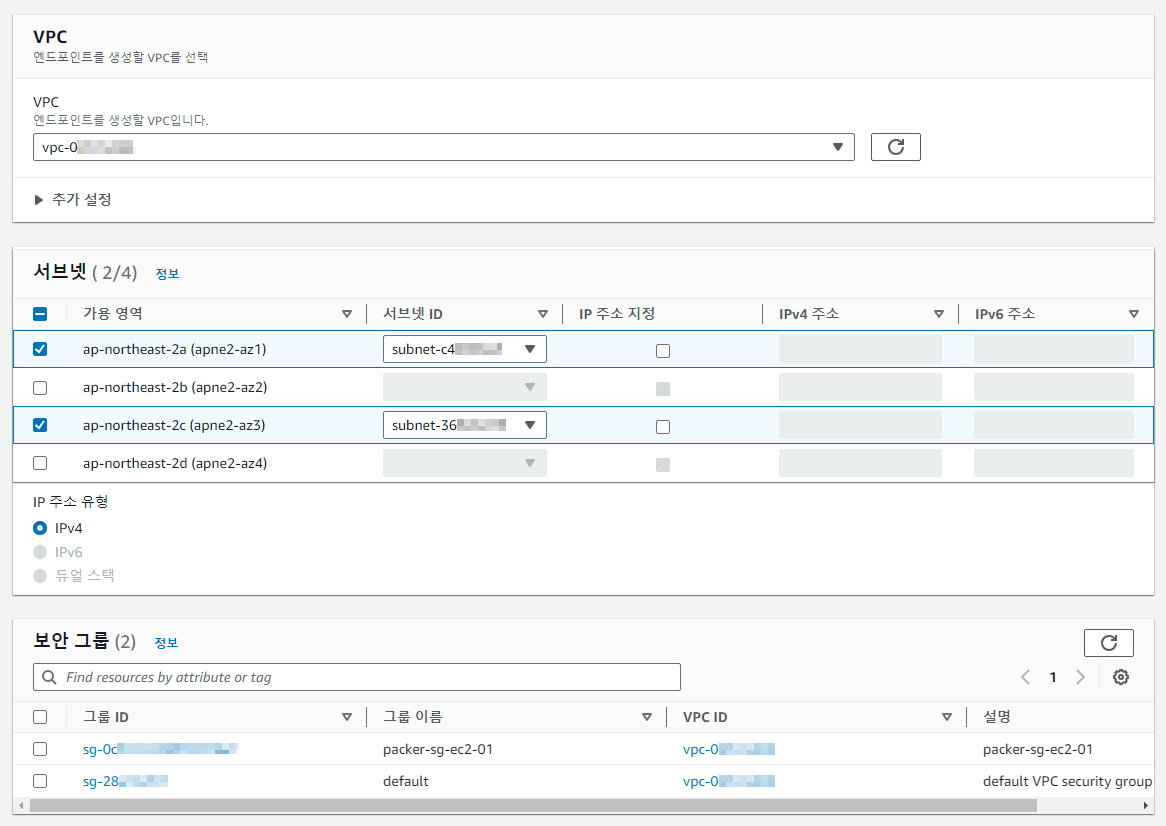 - 엔드포인트를 생성할 VPC 및 서브넷을 선택합니다.