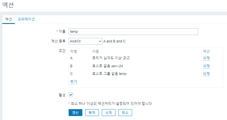 - Conditions 및 Operations: 원하는 조건과 동작 설정. 이러한 설정은 트리거가 발동될 때 어떤 통지가 전송될지를 결정합니다.