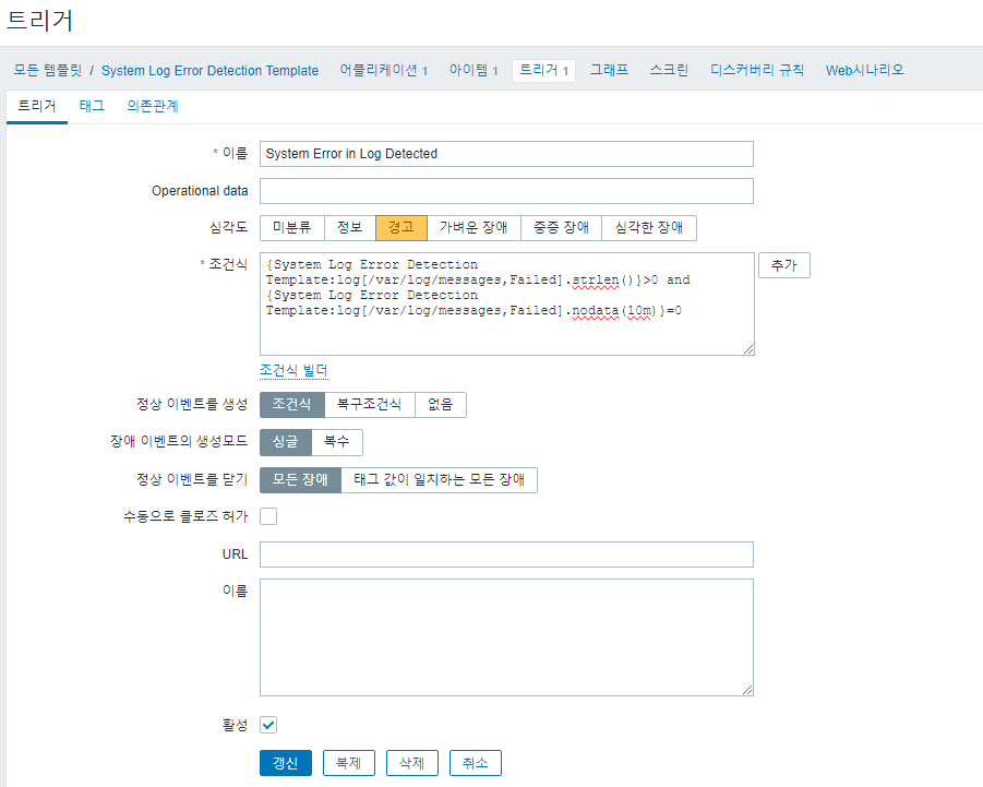 - 조건식 : {Host 이름:Log Monitoring - Messages.last()}=1와 같은 표현식을 설정합니다. 이 표현식은 문자열이 발견되면 트리거를 활성화합니다.