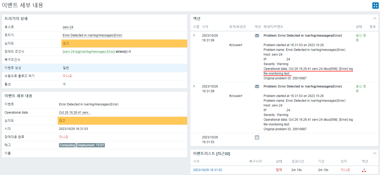 이렇게 설정하면 Zabbix가 /var/log/messages 파일에서 지정된 문자열을 검색하고 해당 문자열을 모니터링하게 됩니다. 필요한 경우 추가적인 설정 및 액션을 사용하여 원하는 작업을 수행할 수 있습니다.
