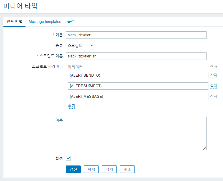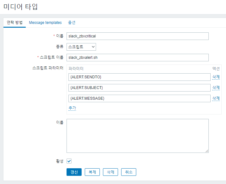 - 이름 : slack_zbx_alert, slack_zbx_critical