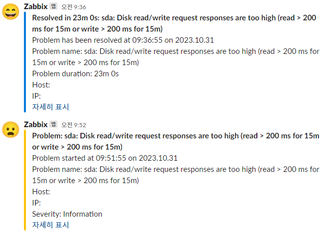 Zabbix 알람 이벤트가 Slack 채널로 메시지로 전송됩니다.